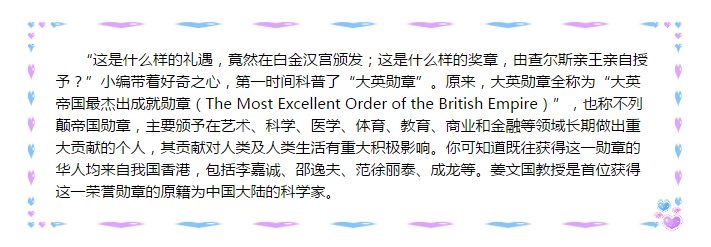 2017年3月16日,英國卡迪夫大學(xué)的華人科學(xué)家姜文國教授在倫敦白金漢宮接受了英國王儲查爾斯親王親自授予的2017年度“大英勛章”,表彰其在“國際癌癥研究方面的突出貢獻”, 成為首位獲得這一榮譽勛章的原籍為中國大陸的科學(xué)家。