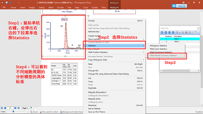 c.當(dāng)完成細(xì)胞周期數(shù)據(jù)分析后,接上面一步,可以通過Statistics按鈕,將相關(guān)的參數(shù)調(diào)出來,具體展示如下: