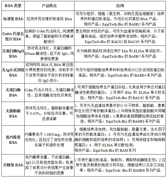 牛血清白蛋白Albumin from bovine serum,BSA,又稱(chēng)為組分V或Cohn V,名稱(chēng)起源于BSA的分餾法——Cohn 冷乙醇法, Cohn 冷乙醇法是由哈佛大學(xué)Edwin Cohn教授于1946年發(fā)明的。當(dāng)時(shí)基于戰(zhàn)爭(zhēng)創(chuàng)傷治療對(duì)注射級(jí)別蛋白的大規(guī)模需求,Cohn教授在較低的溫度下改變血漿的乙醇濃度和pH值,使其所含蛋白在不同乙醇濃度下析出,在第五個(gè)析出的組分中主要成分為BSA,所以BSA又稱(chēng)組分V或Cohn V。Cohn法仍然是目前非常普遍的BSA分餾法。 美國(guó)大的生物原材料供應(yīng)商Equitech-Bio提供經(jīng)典冷乙醇法和先進(jìn)的熱休克法純化的高質(zhì)量、分類(lèi)齊全的BSA,助力您的實(shí)驗(yàn)!