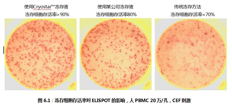 在ELISPOT檢測的應(yīng)用中,往往需要用到凍存的淋巴細(xì)胞樣品作為檢測細(xì)胞。由于ELISPOT檢測的是細(xì)胞的免疫功能,不僅僅需要保持細(xì)胞的存活率,而且還要保證細(xì)胞的功能不發(fā)生變化。傳統(tǒng)的細(xì)胞凍存方法通常是為了保存細(xì)胞,對細(xì)胞存活率的要求不高,更沒考慮保持細(xì)胞原有的免疫狀態(tài),所以傳統(tǒng)的細(xì)胞凍存方法已經(jīng)不能滿足ELISPOT檢測的要求。參見圖7.1。