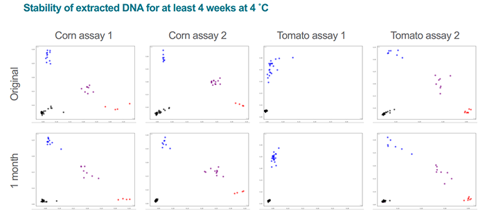 圖2. 用QuickExtract從玉米和番茄中提取的DNA用KASP基因分型技術進行聚類(Original),然后在4℃下儲存1個月,再將樣品進行聚類(1month) ,實驗結果完全一致。