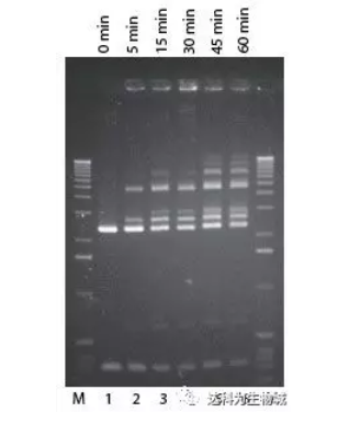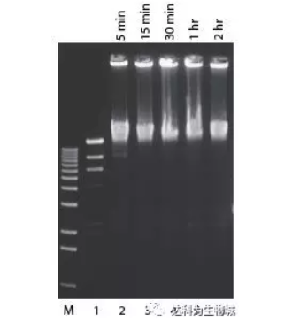 pUC 19 DNA用Pvu II消化,然后按標(biāo)準(zhǔn)連接反應(yīng)使用2U Fast-Link? ligase進(jìn)行連接(泳道1-6). 泳道 M,1-kb ladder;泳道1,無酶對(duì)照;泳道2-6, 分別為5 min, 15 min, 30 min, 45min, 1 hr連接結(jié)果。