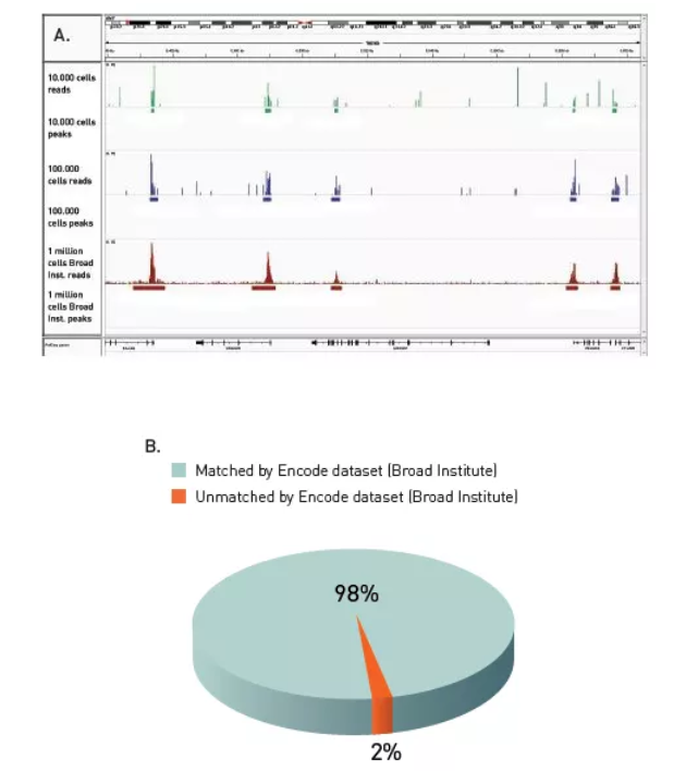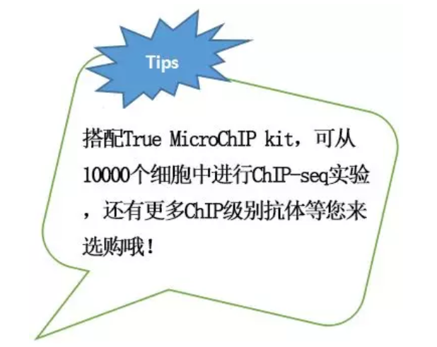 A、用Diagenode的H3K4me3抗體、True MicroChIP Kit進行ChIP實驗,10000個細胞中ChIP下來17pg DNA,對照組35pg DNA。IP下來的DNA用MicroPlex Library Preparation Kit擴增并被轉化為可用于Illumina?平臺測序的文庫,通過IlluminaR Genome Analyzer分析文庫,根據(jù)說明書進行簇生成和測序。