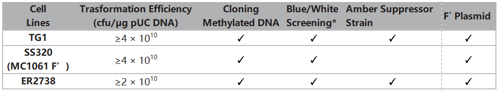 試用裝包含3種電轉(zhuǎn)感受態(tài)細(xì)胞【TG1, SS320 (MC1061 F'), ER2738】,每種感受態(tài)各4個(gè)反應(yīng);