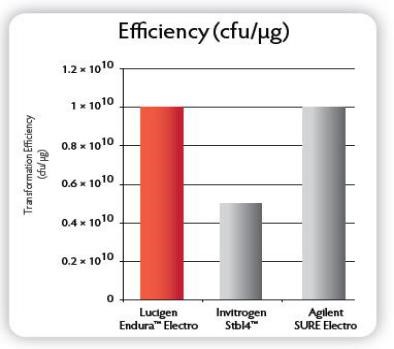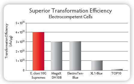 E. cloni? 10G ELITE電轉(zhuǎn)感受態(tài)轉(zhuǎn)化效率≧2×1010 cfu/μg,E. cloni? 10G化學(xué)轉(zhuǎn)感受態(tài)轉(zhuǎn)化效率≧1×109 cfu/μg;
