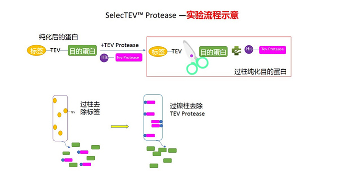 SelecTEV?蛋白酶是一種基因工程改造的煙草蝕刻病毒(TEV)蛋白酶,通過His標(biāo)簽的親和層析從大腸桿菌中純化,SDS-PAGE分析表明其純度為90%。SelecTEV?蛋白酶能夠識別Glu-Asn-Leu-Tyr-Phe-Gln-Gly七個(gè)氨基酸以及與其密切相關(guān)的序列,并在Gln和Gly殘基之間進(jìn)行切割。 這七種氨基酸序列在蛋白質(zhì)中很少見,使得SelecTEV?蛋白酶成為從融合蛋白中去除標(biāo)簽的理想選擇。利用蛋白酶N-末端的His標(biāo)簽通過親和層析即可從酶切反應(yīng)中除去SelecTEV?蛋白酶。