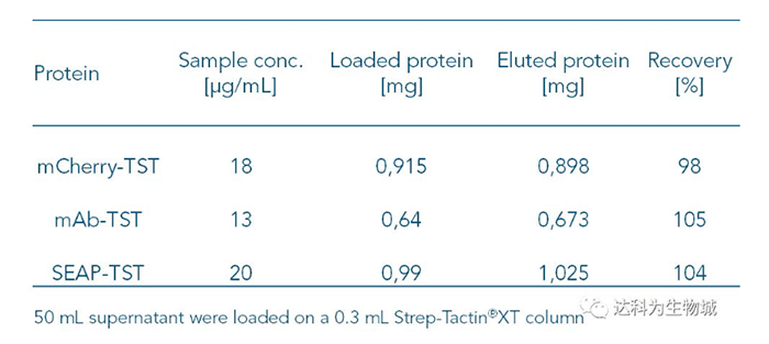 因Strep-Tactin?XT與Twin-Strep-tag蛋白的高親和力,即使目標(biāo)蛋白的濃度低,使用Strep-Tactin?XT仍可以有效的捕捉上清中的目標(biāo)蛋白。表C整理了幾個實(shí)驗(yàn)的數(shù)據(jù),顯示當(dāng)目標(biāo)蛋白濃度低于20μg/ml時,得率仍能達(dá)到幾近100%。