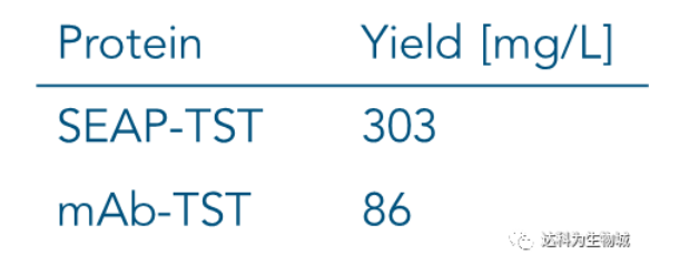 除了上述實(shí)驗(yàn)所用的CHO細(xì)胞株外(中國倉鼠卵巢細(xì)胞),另一常用于生產(chǎn)蛋白的哺乳動物細(xì)胞株為HEK293(人胚胎腎細(xì)胞),使用上較CHO簡單。我們測試了Strep-Tactin?XT的純化表現(xiàn):表D1為以Expi293表達(dá)SEAP-TST或mAb-TST蛋白后,目標(biāo)蛋白的濃度。圖D2為純化表現(xiàn)的SDS-PAGE分析。從中可知,與ExpiCHO培養(yǎng)基相同,直接將表達(dá)好的Expi293上清加入1ml Strep-Tactin?XT高載量重力柱中進(jìn)行純化,一樣能夠快速的得到高純度的目標(biāo)蛋白。