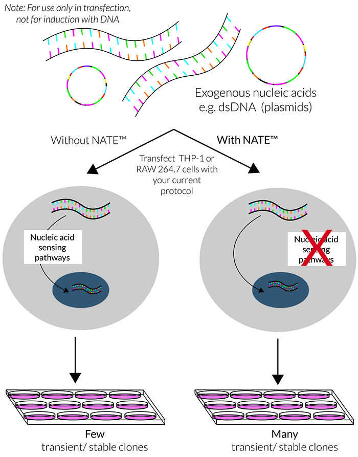 在真核細(xì)胞轉(zhuǎn)染期間,外源核酸(如質(zhì)粒DNA)的主要障礙是它們會被胞質(zhì)傳感器檢測,如cGAS/STING,AIM2炎癥小體和LC3介導(dǎo)的自噬。這些防御性級聯(lián)信號的激活通常會導(dǎo)致低轉(zhuǎn)染效率、降低的細(xì)胞活力和不一致的結(jié)果,尤其是在難轉(zhuǎn)細(xì)胞(如免疫細(xì)胞)的轉(zhuǎn)染實(shí)驗(yàn)中。NATE?抑制許多核酸感應(yīng)途徑,從而保護(hù)外源DNA并促進(jìn)其表達(dá)。
