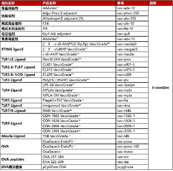 當前,針對COVID-19的疫苗研發(fā)以前所未有的速度在世界范圍內(nèi)陸續(xù)開展,世界各地的科學(xué)家正在探索開發(fā)針對SARS-CoV-2的有效疫苗的所有潛在策略。大多數(shù)用于COVID-19的候選疫苗旨在誘導(dǎo)針對病毒S蛋白的中和抗體,防止病毒通過人ACE2受體攝取從而阻止感染。COVID-19疫苗開發(fā)前景的顯著特征是正在評估的技術(shù)平臺的多樣性,包括:減毒活疫苗,基于病毒載體的疫苗,基于重組蛋白的疫苗,DNA疫苗和RNA疫苗。其中重組蛋白疫苗通常使用SARS-CoV-2蛋白(例如S蛋白)在宿主中引起免疫反應(yīng)。通常與佐劑結(jié)合使用以提高免疫原性。迄今為止,已進入臨床試驗的COVID-19候選疫苗包括Moderna開發(fā)的mRNA疫苗(NCT04283461)和康希諾 (NCT04341389)開發(fā)的重組腺病毒疫苗。此外,諸如AS03和MF59等佐劑正在重組蛋白疫苗中進行探索,使用佐劑可增強免疫原性并降低劑量,使更多人接種疫苗成為可能。天然免疫專家InvivoGen提供科研用途的佐劑和OVA產(chǎn)品供研究人員選擇。